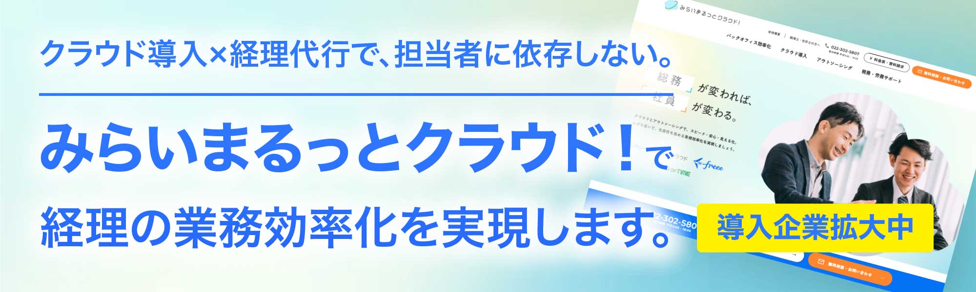みらい創研税理士法人の所属するみらい創研グループには社会保険労務士・行政書士など各専門家の他、融資、財務コンサルティング、経理効率化コンサルティング、人材コンサルティング、事業承継、M&Aなど会社が抱える課題別に最適なご提案ができる人材が在籍しております。
